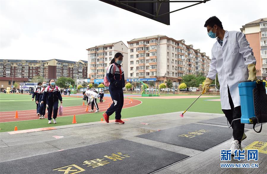6月1日,长春市第103中学校医进行早间消毒。 当日是“六一”国际儿童节,吉林长春市初一、初二年级和小学五、六年级正式开学复课,涉及学生12.7万人。 新华社记者 林宏 摄