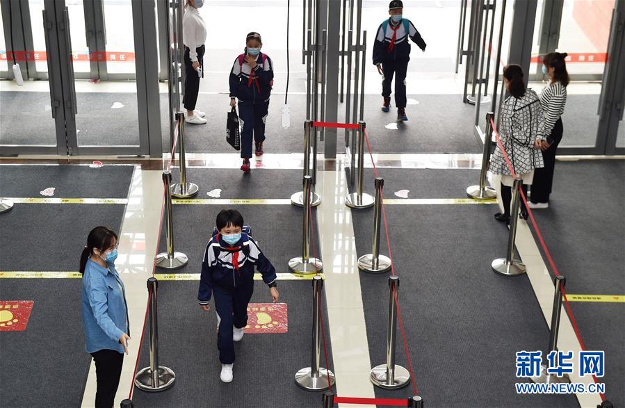 6月1日,长春市第103中学学生走进教学楼。 当日是“六一”国际儿童节,吉林长春市初一、初二年级和小学五、六年级正式开学复课,涉及学生12.7万人。 新华社记者 林宏 摄