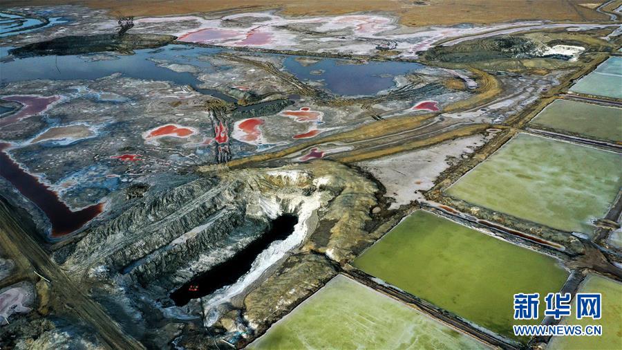 5月31日拍摄的陕西定边盐湖群中最大的盐湖苟湖(无人机照片)。 定边盐湖群位于陕西省西北部的定边县境内,西与宁夏盐池县接壤,北与内蒙古鄂尔多斯市鄂托克前旗相连,是陕西唯一的湖盐产区。其中最大的盐湖——苟池,由于湖中含有大量藻类和不同矿物质成分,阳光下呈现出绚烂色彩,美不胜收。 新华社记者 刘潇摄