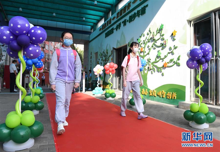 6月1日,在北京市海淀区双榆树第一小学,六年级学生走进校园。 当日,北京市中学高一、高二年级,初一、初二年级和小学六年级的学生返校复课,此次返校复课涉及北京市千余所中小学校共40多万名学生。 新华社记者 任超 摄