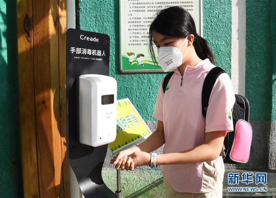 6月1日,在北京市海淀区双榆树第一小学,六年级学生进入教学楼前进行手部消毒。 当日,北京市中学高一、高二年级,初一、初二年级和小学六年级的学生返校复课,此次返校复课涉及北京市千余所中小学校共40多万名学生。 新华社记者 任超 摄