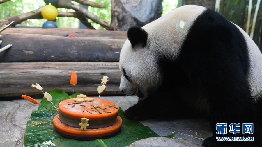 6月1日,大熊猫“舜舜”在品尝节日礼物“冰蛋糕”。新华社记者 杨冠宇 摄