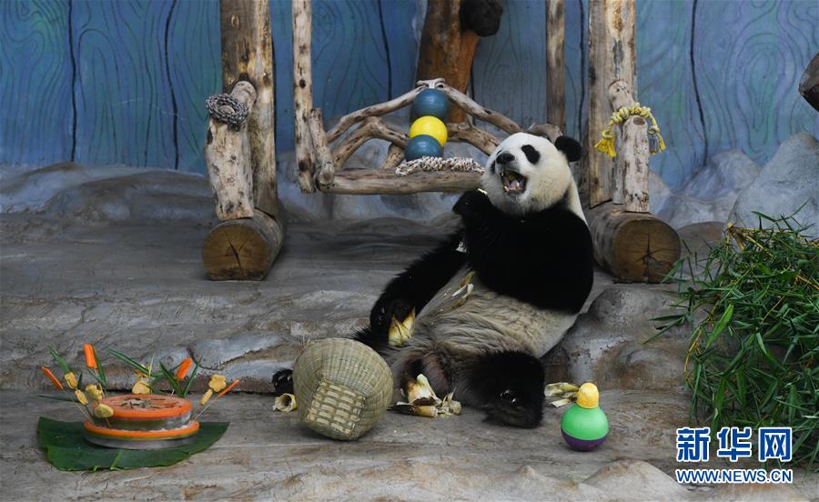 6月1日,大熊猫“贡贡”在进食。新华社记者 杨冠宇 摄