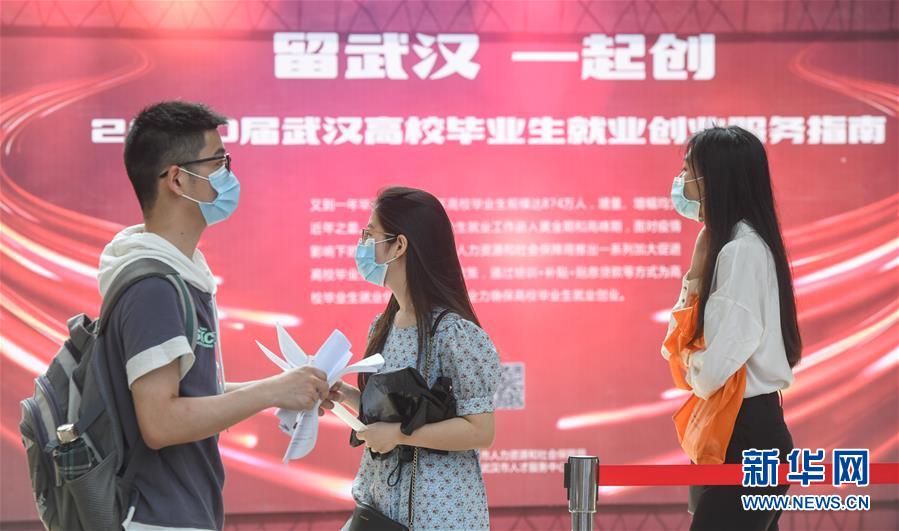 6月1日,几位求职者在招聘会现场。 当日,一场大型招聘会在江汉大学校园举办,这是疫情发生后,武汉举办的首场高校毕业生专场线下招聘会。武汉市人社部门从报名的企业中,遴选了80多家企业参加,专门招聘高校毕业生。据介绍,武汉市近期还将密集举办8场面向大学毕业生的专场招聘会,涵盖了大数据、云计算、现代服务业、金融业等领域,预计将提供约1万个优质岗位。 新华社记者 程敏 摄