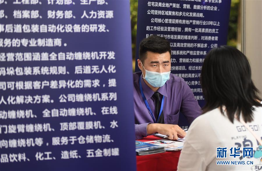 6月1日,求职者在招聘会上与企业招聘人员洽谈。 当日,一场大型招聘会在江汉大学校园举办,这是疫情发生后,武汉举办的首场高校毕业生专场线下招聘会。武汉市人社部门从报名的企业中,遴选了80多家企业参加,专门招聘高校毕业生。据介绍,武汉市近期还将密集举办8场面向大学毕业生的专场招聘会,涵盖了大数据、云计算、现代服务业、金融业等领域,预计将提供约1万个优质岗位。 新华社记者 程敏 摄