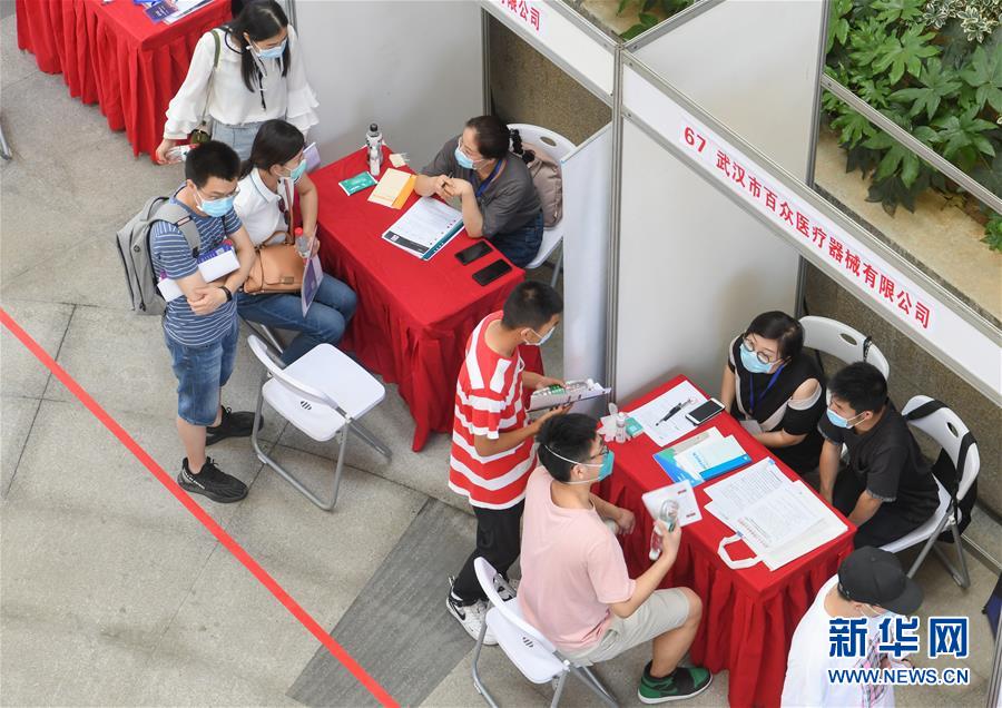 6月1日,求职者在招聘会上与招聘人员洽谈。 当日,一场大型招聘会在江汉大学校园举办,这是疫情发生后,武汉举办的首场高校毕业生专场线下招聘会。武汉市人社部门从报名的企业中,遴选了80多家企业参加,专门招聘高校毕业生。据介绍,武汉市近期还将密集举办8场面向大学毕业生的专场招聘会,涵盖了大数据、云计算、现代服务业、金融业等领域,预计将提供约1万个优质岗位。 新华社记者 程敏 摄