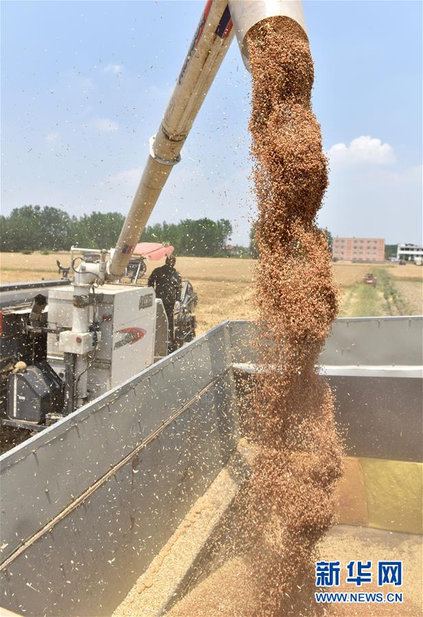 6月1日,在安徽省巢湖市苏湾镇道胜家庭农场,农民在田间装运刚收割的小麦。新华社发(马丰成 摄)