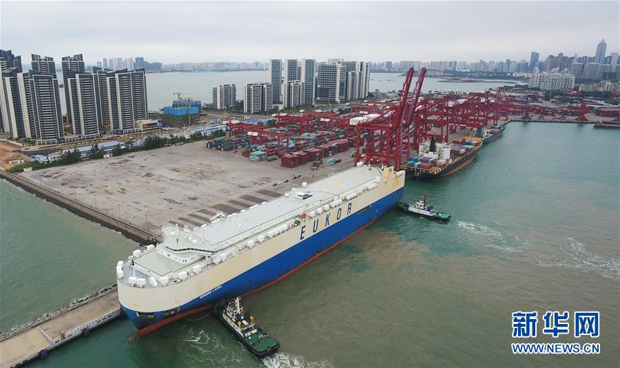 滚装货船“劳拉”轮驶入海口秀英港,这是海南自贸区政策实施以来的首艘汽车外贸船(2月16日摄,无人机照片)。 新华社记者 杨冠宇 摄