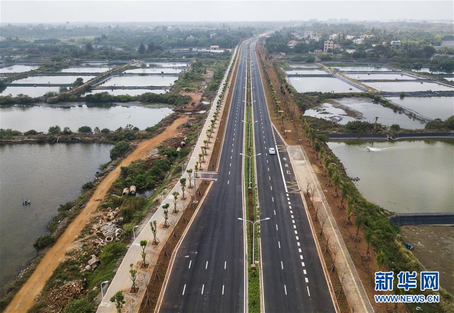 这是4月1日拍摄的位于海口江东新区的东寨港大道(无人机照片)。 新华社记者 蒲晓旭 摄