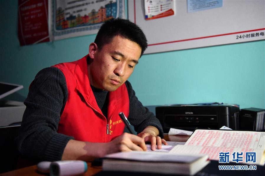 杨龙明在小区内的值班室整理下沉日记(6月1日摄)。新华社记者 李然 摄