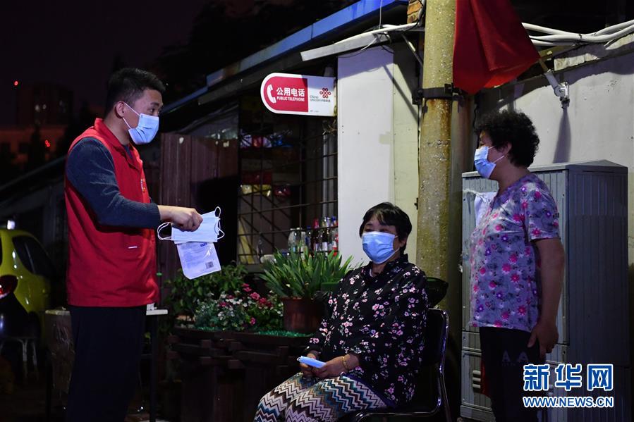 杨龙明在小区内给住户发放口罩(6月1日摄)。新华社记者 李然 摄
