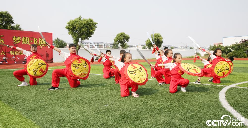 央视网消息:2020年6月1日,在江苏省海安市城东镇韩洋小学,学生在练习武术。当日是“六一”国际儿童节,江苏省海安市城东镇韩洋小学举办庆“六一”特色活动展示,来自该校200多名学生进行了武术展演。(向中林 摄)