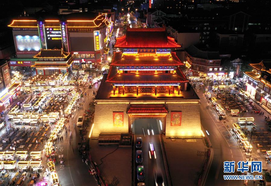 这是河南开封鼓楼夜市(无人机照片,6月1日摄)。 近日,古都开封陆续恢复开放小吃夜市、御河夜游等夜间消费项目,同时推出了一批新的夜间游览活动,并采取限时免费等措施,促进“夜经济”逐步复苏。 新华社记者李安摄