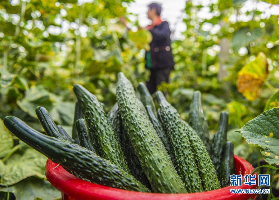6月2日,枣强县恩察镇郭堂村的菜农在采摘黄瓜。新华社记者 李晓果 摄