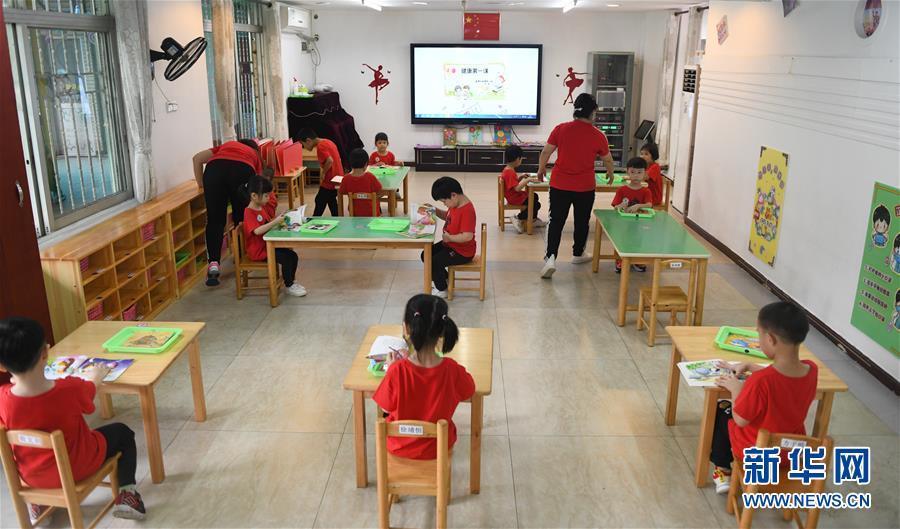 6月2日,广州市荔湾区桃源幼儿园的小朋友在教室里上课。新华社记者 卢汉欣 摄