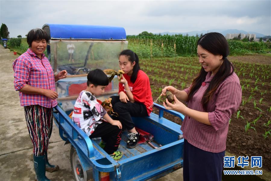6月1日,结束劳动的彭小英(右一)一家人在吃自己做好的粽子。 在浙江温州瑞安的马屿镇霞岙村,50岁的范得多和45岁的彭小英夫妇,除了照看八亩农田之外,最大的乐趣就是一起跳自编的“曳步舞”。田埂间、家门口、桥墩下,音乐响起,他们随时起舞。 十八年前,丈夫范得多曾在一次车祸中受伤,并因惊惧过度患上抑郁症。四年前,妻子彭小英开始带着丈夫一起跳舞,二人在热情的舞蹈中挥洒汗水,范得多的情况出现了明显好转。 现在,彭小英和范得多在抖音账户上共有140余万粉丝。每天晚上,他们直播跳舞,屏幕前漾出的笑容感染着越来越多的人。“有活干,有舞跳,我们现在的生活真的很好!”范得多说。 新华社记者郑梦雨 摄