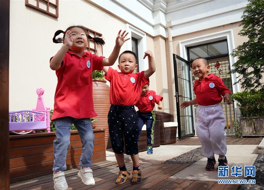 6月2日,在上海市徐汇区梅陇幼儿园,小班小朋友在练习快乐健身操。新华社记者 刘颖 摄