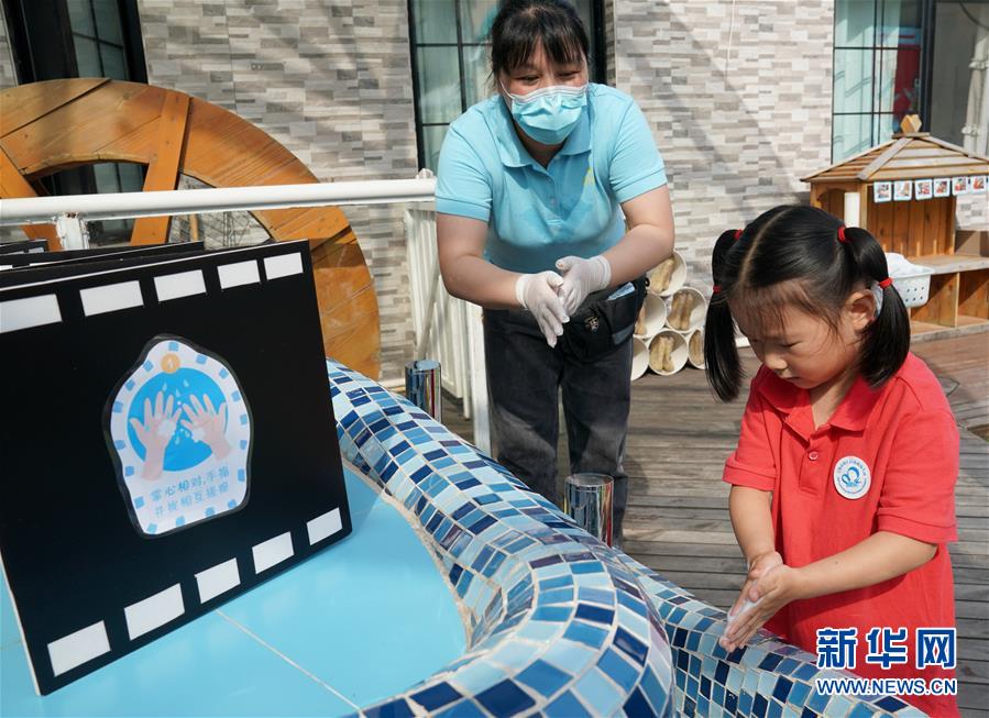 6月2日,在上海市徐汇区梅陇幼儿园,保育员提醒小朋友按照“七步洗手法”好好洗手。新华社记者 刘颖 摄