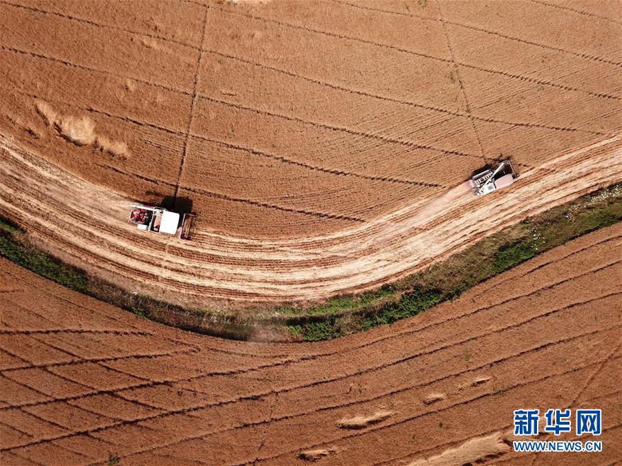 6月2日,在合肥市蜀山区小庙镇马岗村,农机手操作机械设备收割小麦(无人机照片)。 新华社记者刘军喜摄