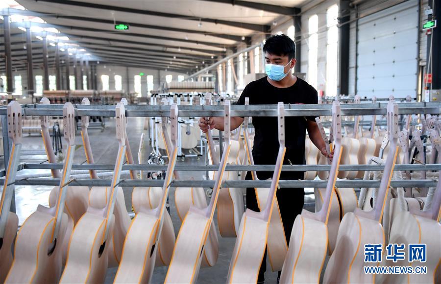 6月2日,工人在武强县一家乐器厂生产车间内查看吉他半成品。 近年来,河北省武强县创新“乐器+”产业扶贫模式,依托当地乐器行业龙头企业,吸纳贫困群众参与到乐器文化全产业链中,带动他们稳定就业。 新华社记者 朱旭东 摄