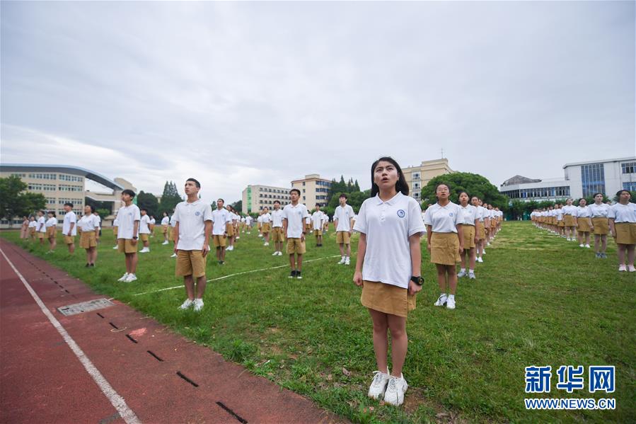 6月2日,浙江和田高中班的学生们参加学校的升旗仪式并唱国歌。新华社记者 徐昱 摄
