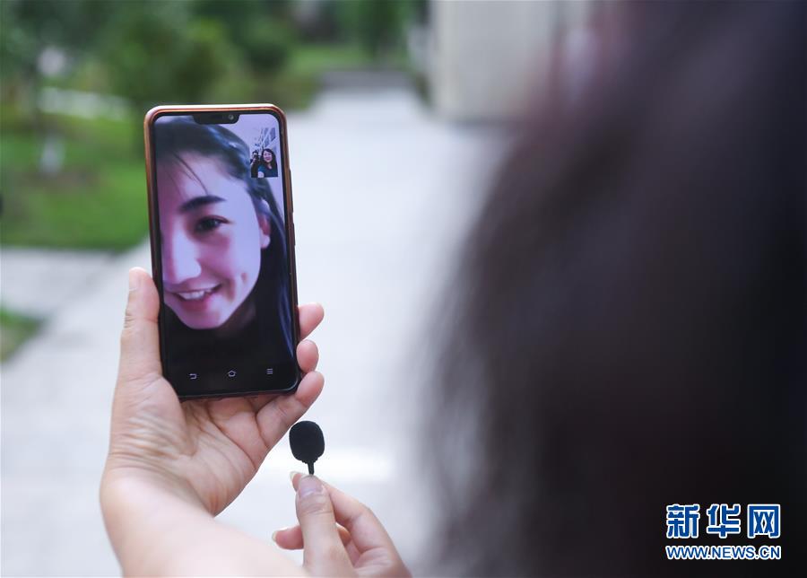 6月1日,已经回到新疆和田备考的浙江和田高中班高三女生帕丽达与老师视频连线,告诉老师最近的备考情况。新华社记者 徐昱 摄