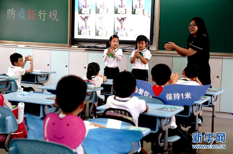 6月2日,上海闵行区鑫都小学,老师指导一年级小学生如何正确洗手。 当日,上海小学一、二、三年级学生返校开学。 新华社记者 张建松 摄