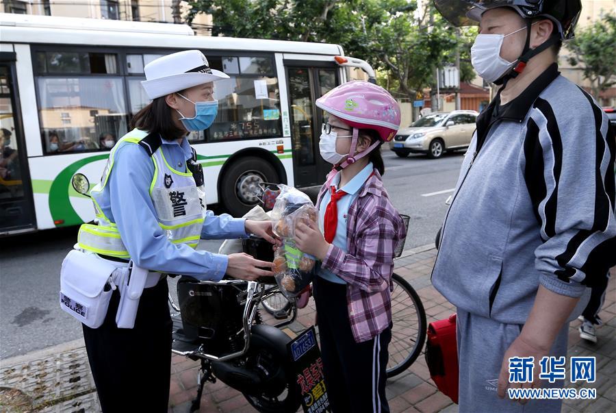 6月2日,上海市公安局徐汇分局交警支队民警朱晓菁在徐汇区逸夫小学门前,向乘坐电动自行车佩戴头盔的小学生赠送警熊玩偶。新华社记者 凡军 摄
