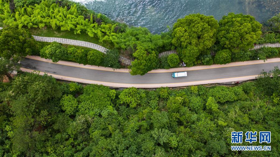 6月2日,车辆在阿哈湖国家湿地公园内行驶(无人机照片)。 初夏时节,贵州省贵阳市阿哈湖国家湿地公园草木苍翠,风景如画,吸引人们前来休闲游玩。 新华社记者 陶亮 摄
