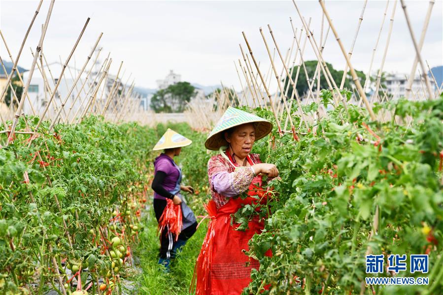 6月1日,农民在贵州省榕江县车江坝区管理西红柿。 贵州省黔东南苗族侗族自治州榕江县是国家扶贫开发工作重点县,也是贵州省目前尚未脱贫摘帽的9个县之一。今年以来,榕江县通过流转车江坝区土地,充分利用坝区地势平坦、土壤肥沃、气候温和、交通便利等优势,大力推进辣椒、西红柿、茄子、百香果等规模化订单农业种植,吸收当地群众从事种植、管理、采收等工作,助农脱贫增收。 新华社记者 杨文斌 摄