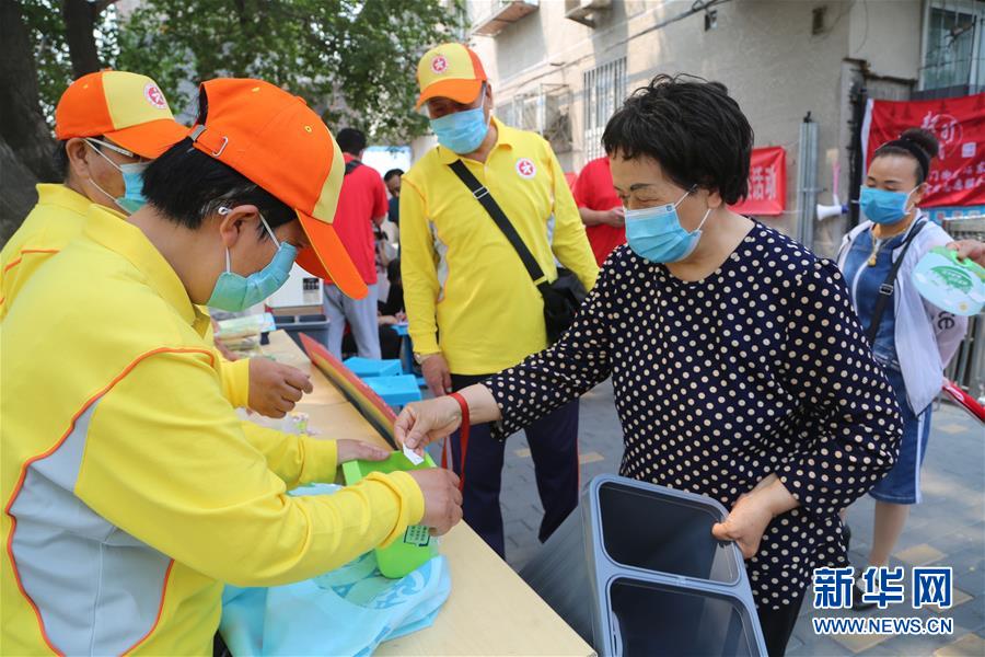 北京市东城区公共文明引导员建国门中队队员与建国门街道站东社区的社区工作者一起,为市民普及垃圾分类知识(5月30日摄)。新华社发(北京市东城区建国门街道供图)
