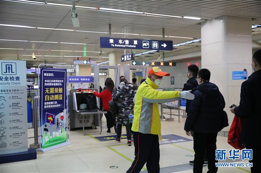 北京市公共文明引导员在地铁站内引导乘客有序排队安检(3月9日摄)。新华社发(首都文明办供图)