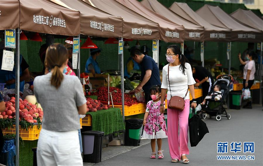 6月2日,在西安市曲江新区公田二路,市民在临时摊区选购果蔬。 近日,陕西省出台《陕西省促进市场消费积极应对新冠肺炎疫情影响若干措施》,在确保安全的情况下,允许城区临街店铺出店经营,允许在居民居住集中区开辟临时摊点摊区,允许流动商贩在一定时间和区域占道经营。 西安市曲江新区城市管理部门在做好疫情防控工作的前提下,在固定时间、固定区域开辟临时摊点,积极推进“地摊经济”发展。 新华社记者 张博文 摄