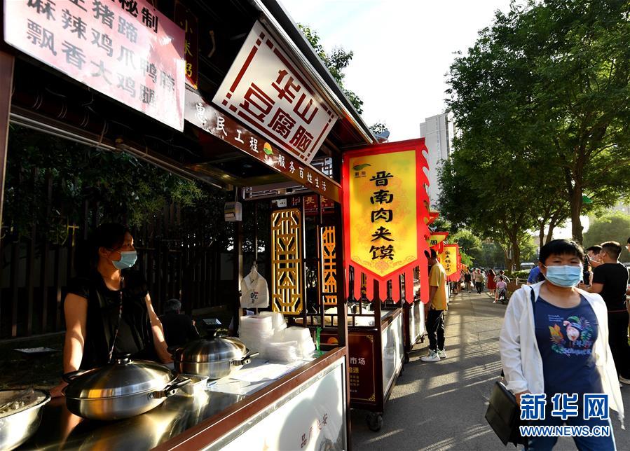 6月2日,在西安市曲江新区金滹沱二路,经营者在临时摊区售卖食品。 近日,陕西省出台《陕西省促进市场消费积极应对新冠肺炎疫情影响若干措施》,在确保安全的情况下,允许城区临街店铺出店经营,允许在居民居住集中区开辟临时摊点摊区,允许流动商贩在一定时间和区域占道经营。 西安市曲江新区城市管理部门在做好疫情防控工作的前提下,在固定时间、固定区域开辟临时摊点,积极推进“地摊经济”发展。 新华社记者 张博文 摄