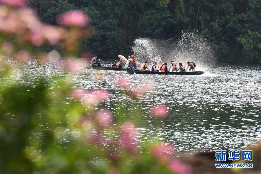 6月2日,游客在云南丘北县普者黑仙人洞村的湖上乘船游玩。新华社记者 杨宗友 摄