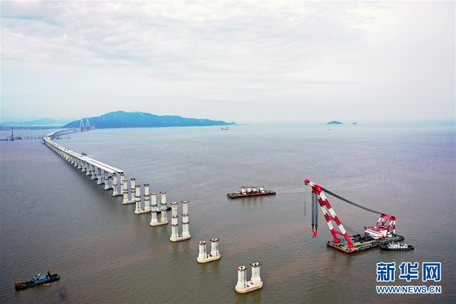 6月2日拍摄的在建中的舟岱大桥项目七十米跨非通航孔桥墩身安装区(无人机照片)。 在浙江省舟山市定海区马目海域,在建中的舟岱大桥初现雏形,各标段正全力冲剌。据了解,截至2020年5月底,浙江省交通集团宁波舟山港主通道项目工程中的舟岱大桥项目已累计完成形象进度76%。 新华社发(姚峰 摄)