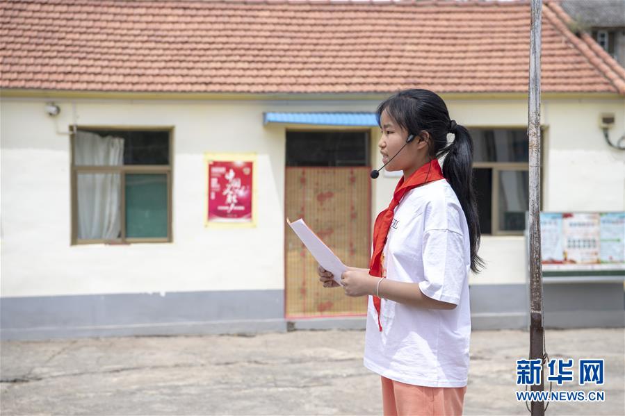 6月2日,秦春兰在学校的升旗仪式上发言。 新华社记者 杨晨光 摄