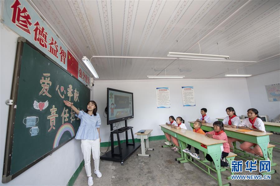 6月2日,马武寨寄小学的英语老师陈燕子为学生们上开学第一课。 新华社记者 杨晨光 摄