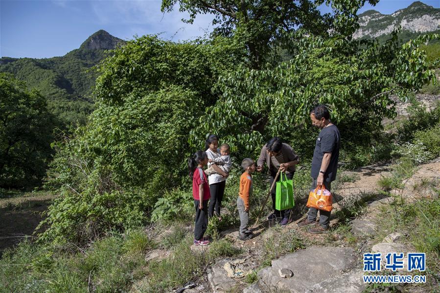 秦春兰(左二)、秦秋兰(左一)和秦兴旺(右三)在南背村迎接老师们的到来(5月31日摄)。 新华社记者 杨晨光 摄