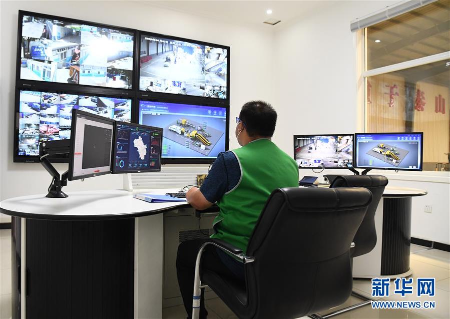 6月3日,在海淀区再生资源回收分拣加工中心,工作人员在监控室监视自动化破碎设备运行状况。新华社记者 任超 摄