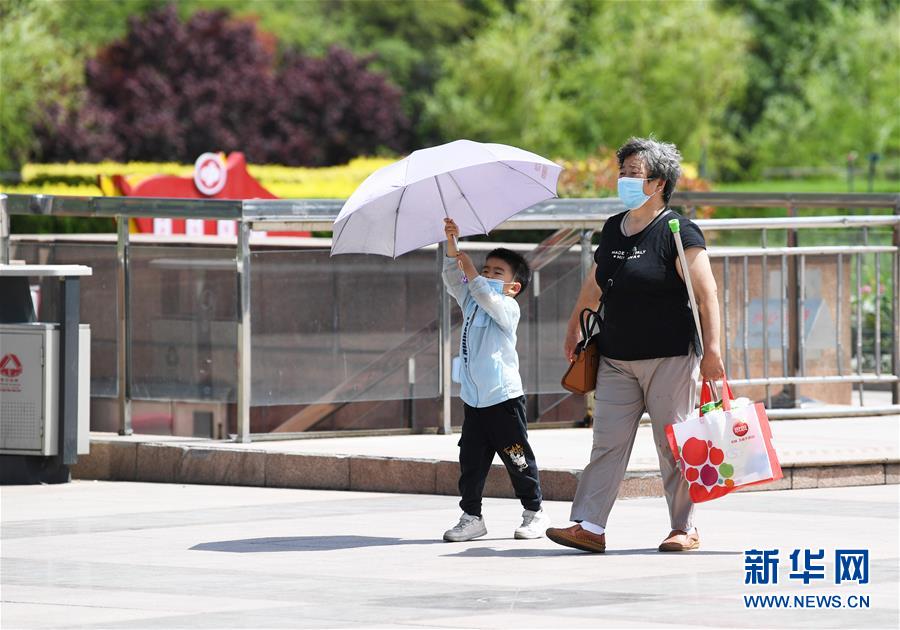 6月3日,济南市民在烈日下行走。 山东省气象台于6月2日16时00分发布高温黄色预警信号,预计3日至5日鲁西北的西部、鲁中和鲁南地区的日最高气温可达35℃以上,部分地区可达37℃以上。 新华社记者 王凯 摄
