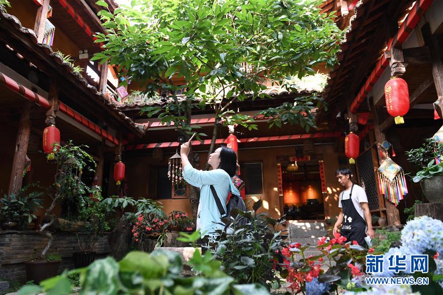 6月2日,游客在云南丘北县普者黑仙人洞村一家客栈内拍照。新华社记者 杨宗友 摄