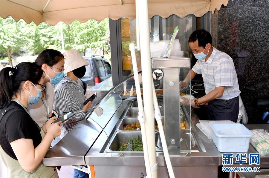 6月3日,李恺(右一)在给顾客打餐。新华社记者 刘潇 摄