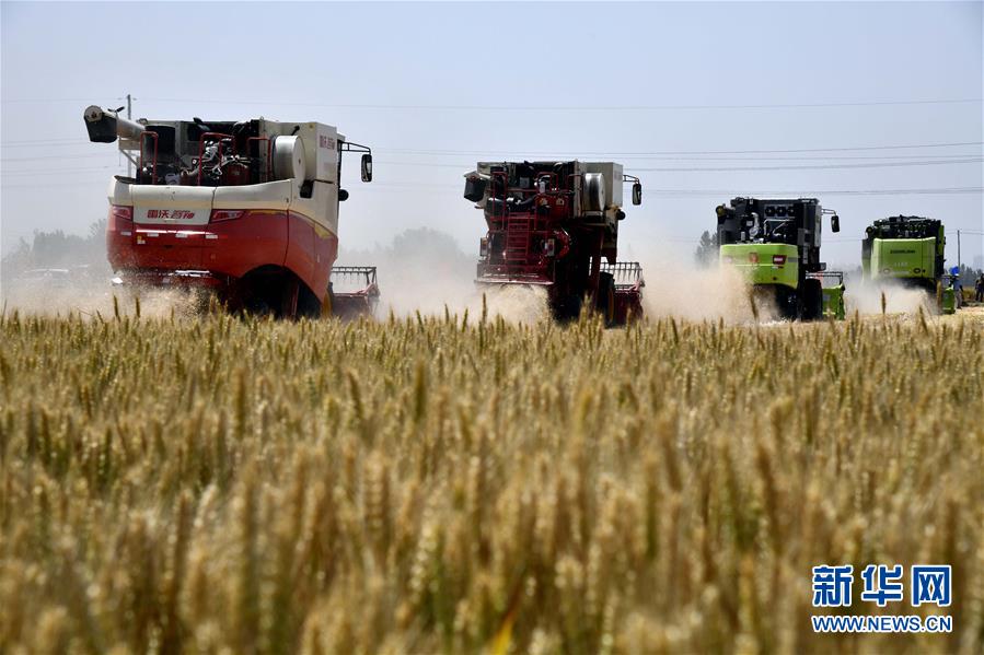 6月3日,收割机在汶上县郭仓镇的麦田里收获小麦。 目前,我国第二大小麦主产区山东6000多万亩小麦进入收获阶段。农民们抢抓有利天气,自南向北陆续开镰。 新华社记者 郭绪雷 摄