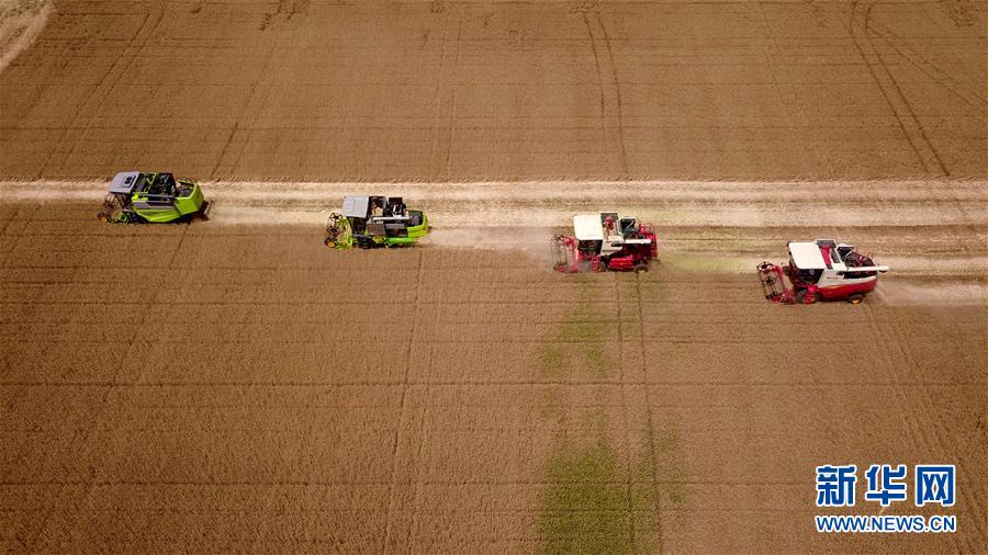 6月3日,在汶上县郭仓镇,收割机在收获小麦(无人机航拍)。 目前,我国第二大小麦主产区山东6000多万亩小麦进入收获阶段。农民们抢抓有利天气,自南向北陆续开镰。 新华社记者 郭绪雷 摄