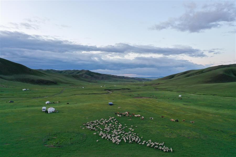 牧群和蒙古包分布在阿鲁科尔沁草原上(6月3日摄,无人机照片)。新华社记者 刘磊 摄