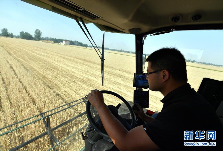 在河南省郸城县东风乡前于洼村,王连杰驾驶收割机收麦(5月27日摄)。 新华社记者 李嘉南 摄