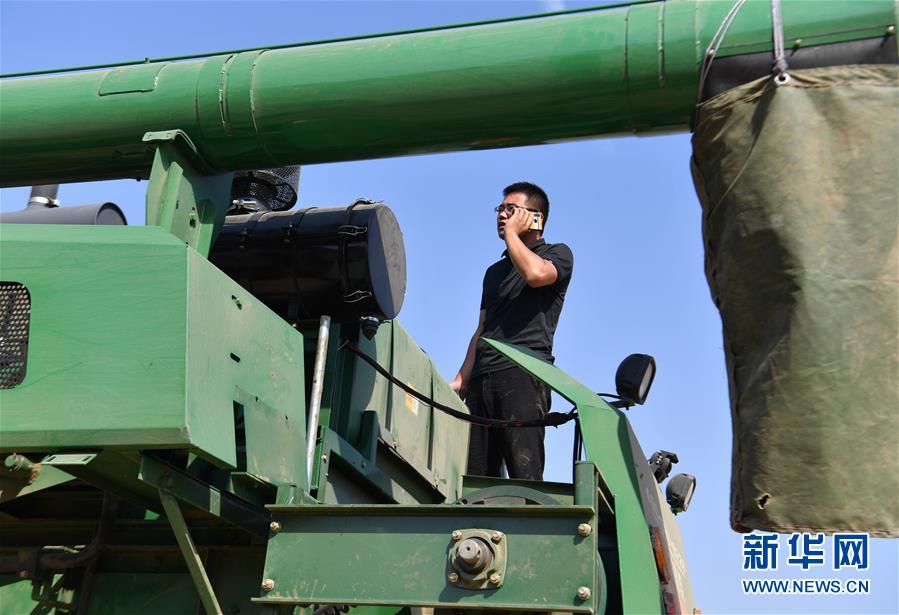 在河南省郸城县东风乡前于洼村,王连杰打电话咨询收割机水箱清理注意事项(5月27日摄)。 新华社记者 李嘉南 摄