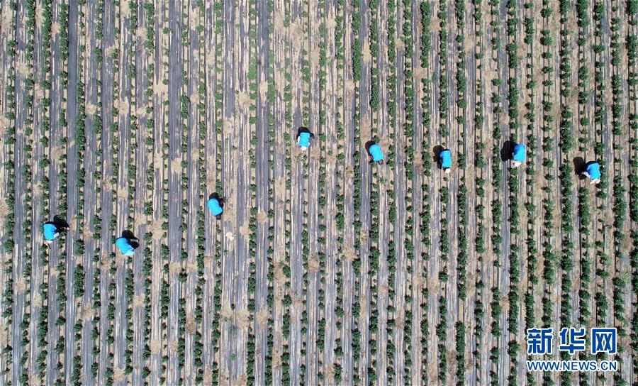 6月3日,在河北省石家庄市行唐县南桥镇东安太庄村皇菊花种植基地,农户在进行除草作业(无人机照片) 。 新华社发(梁子栋 摄)