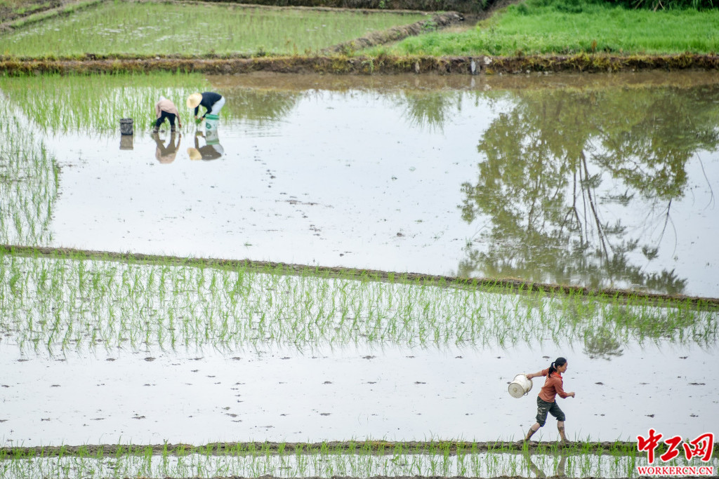 2020年6月4日,江西省吉安市遂川县泉江镇洋村村,农民在整田、插秧。芒种时节,时不待我,遂川县农民抢抓农时,抢插中稻,确保粮食丰产丰收。肖远泮/IC photo